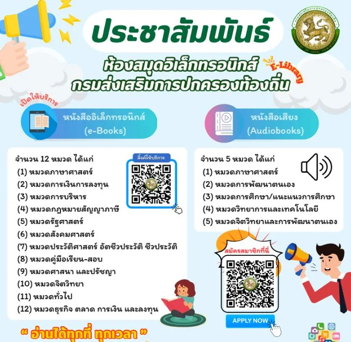 • บริการห้องสมุดอิเล็กทรอนิกส์ (E-Library) ของกรมส่งเสริมการปกครองท้องถิ่นประจำปีงบประมาณ พ.ศ. 2568