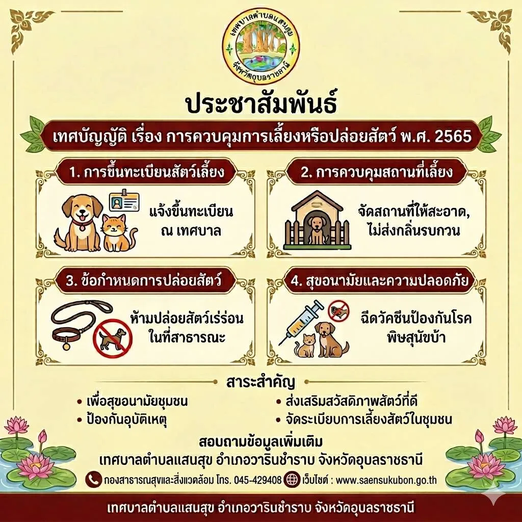 • ประกาศเจตนารมณ์ "สุจริต โปร่งใส เทศบาลตำบลแสนสุขใสสะอาด 2569" และ "งดรับ งดให้" ของขวัญของกำนัลทุกชนิดจากการปฏิบัติหน้าที่ (No Gift policy) ของเทศบาลตำบลแสนสุข