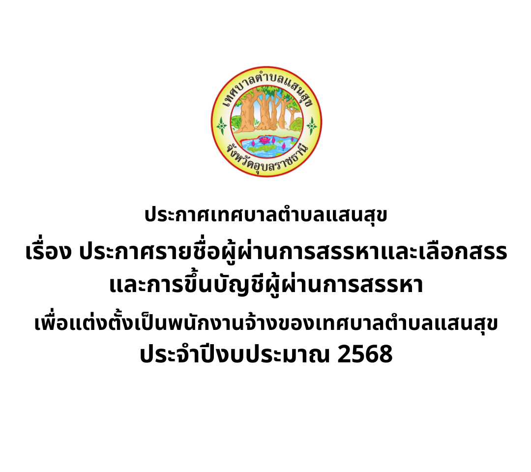 ประกาศเทศบาลตำบลแสนสุข เรื่อง ประกาศรายชื่อผู็ผ่านการสรรหาและเลือกสรร และการขึ้นบัญชีผู้ผ่านการสรรหา เพื่อแต่งตั้งเป็นพนักงานจ้างของเทศบาลตำบลแสนสุข ประจำปีงบประมาณ 2568