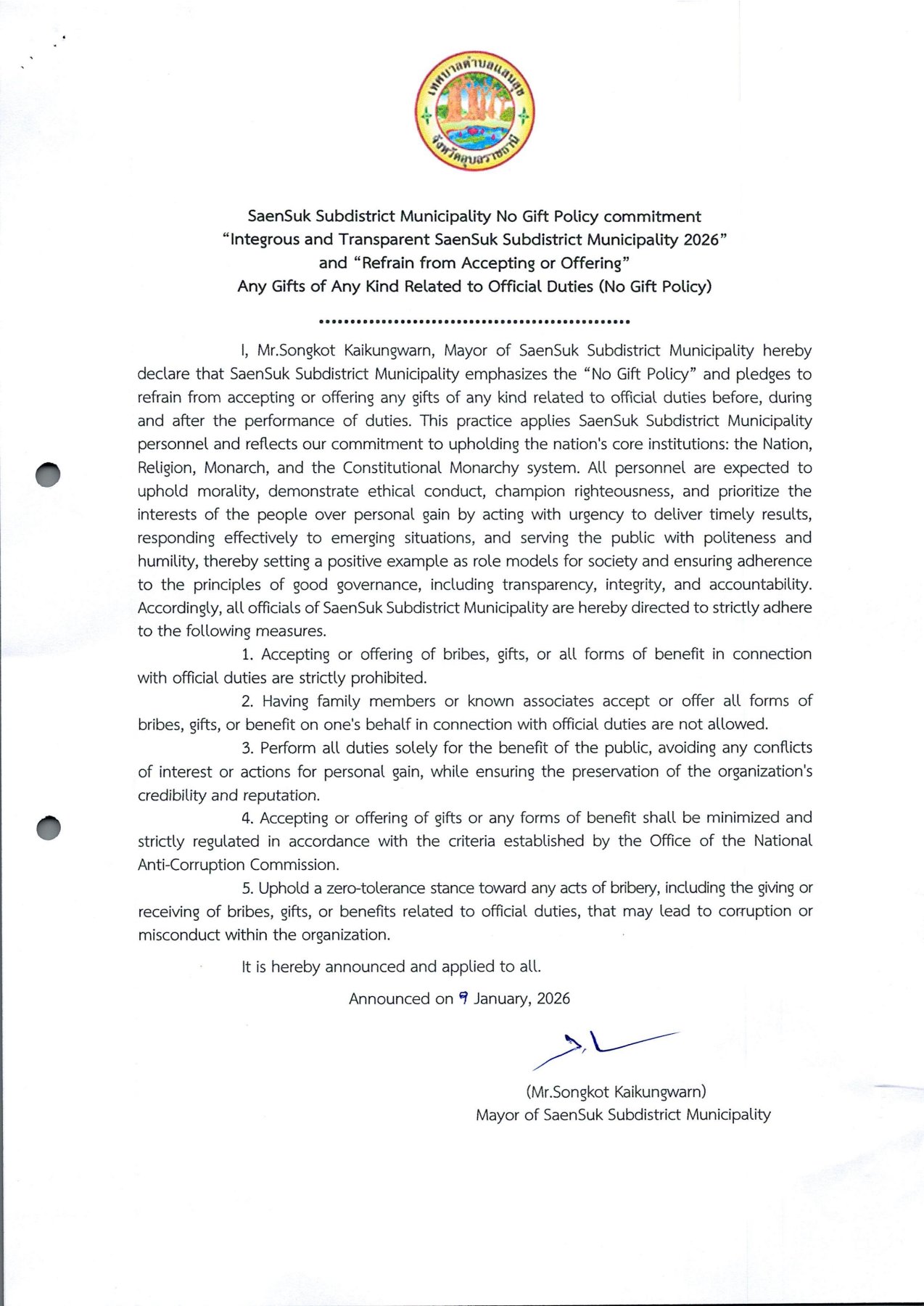 ประกาศเจตนารมณ์ "สุจริต โปร่งใส เทศบาลตำบลแสนสุขใสสะอาด 2569" และ "งดรับ งดให้" ของขวัญของกำนัลทุกชนิดจากการปฏิบัติหน้าที่ (No Gift policy) ของเทศบาลตำบลแสนสุข