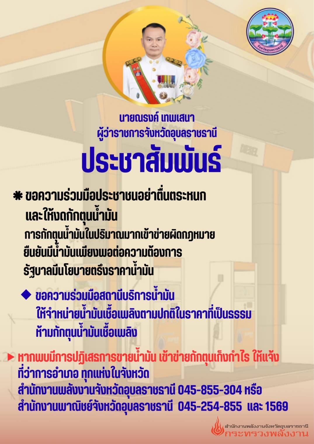 🛑 จังหวัดอุบลราชธานี ขอความร่วมมือประชาชน อย่าตื่นตระหนก และงดการกักตุนน้ำมันเชื้อเพลิง เนื่องจากการกักตุนในปริมาณมากอาจเข้าข่ายผิดกฎหมาย และเสี่ยงอันตรายจากการจัดเก็บที่ไม่ถูกวิธี ⚠️