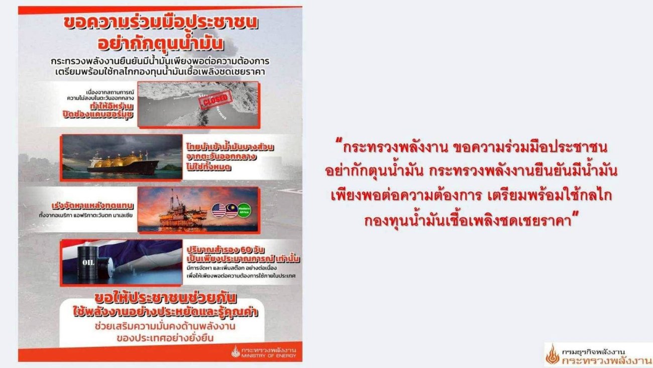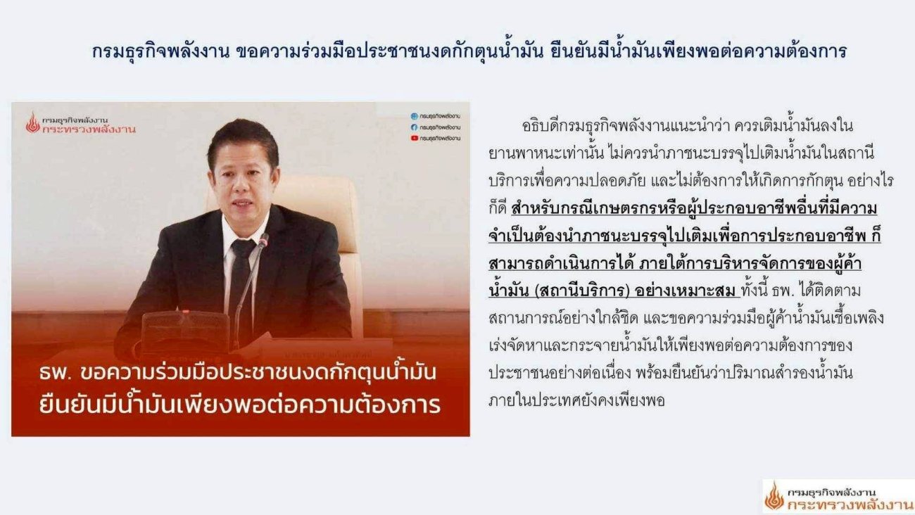 ให้จำหน่ายน้ำมันเชื้อเพลิงตามปกติ ห้ามกักตุนหรือฉวยโอกาสขึ้นราคาโดยไม่เป็นธรรม