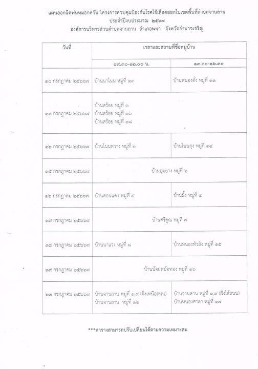 ข่าวประชาสัมพันธ์ องค์การบริหารส่วนตำบลจานลาน โดย กองสาธารณสุขและสิ่งแวด ดำเนินการออกให้บริการฉีดพ่นหมอกควันเพื่อกำจัดยุงลาย ในพื้นที่ตำบลจานลาน ระหว่างวันที่ 10-23 กรกฎาคม 2567 ตามกำหนดการที่แจ้ง จึงขอความร่วมมือจากประชาชนทุกครัวเรือน ก่อนที่เจ้าหน้าที่จะดำเนินการพ่นหมอกควัน ให้ เปิดประตู หน้าต่าง อาคารบ้านเรือนของตนเอง ให้คนและสัตว์เลี้ยงออกจากอาคารบ้านเรือน ไปอยู่ในที่แจ้ง โดยเฉพาะผู้สุงอายุ ผู้พิการผู้ป่วยเรื้อรัง ผู้ป่วยติดเตียง